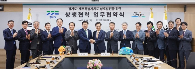 이미지 확대보기이에 18일 김동연 경기도지사와 오영훈 제주특별자치도지사는 경기도청에서 이런 내용을 담은 9개 과제에 관한 상생협력 업무협약을 체결했다.