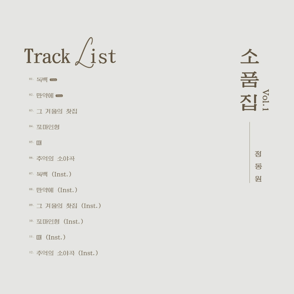 지난 19일 공식 소셜네트워크서비스(SNS) 계정을 통해 공개된 트랙리스트에 따르면, 이번 신보에는 타이틀곡 ‘독백’, ‘만약에’를 비롯해 '그 겨울의 찻집', '꼬마인형', '때', '추억의 소야곡' 6곡과 각 곡의 인서트 음원까지 총 12곡이 수록된다.