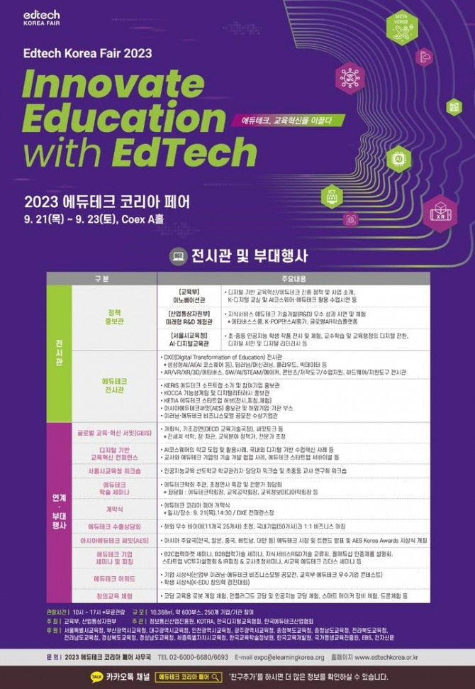 올해로 18회째인 이번 박람회는 ‘에듀테크, 교육혁신을 이끌다’를 주제로 국내기업 192곳, 해외기업 38곳 등 230개 기업이 참여한다. 기업의 다양한 에듀테크 제품과 서비스가 전시되고, 국내기업 대상 수출상담회와 투자유치 설명회, 에듀테크 비즈니스 모델 공모전 시상식 등이 함께 진행된다.