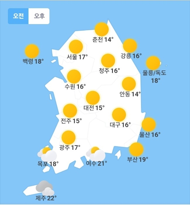 낮 최고기온은 서울 28도, 대구 26도로 아침과 비교해 10도 안팎으로 크게 오를 것으로 기상청은 전망했다.