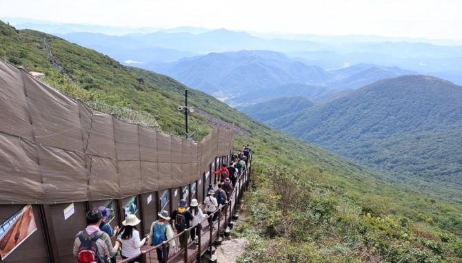 이미지 확대보기광주시와 국립공원공단은 23일 오전 무등산 정상 상시 개방 개통식을 열었다. 상기 개방 구간은 서석대 주상절리에서 군부대 후문 옆을 지나 인왕봉 전망대까지 왕복 약 390m다. 폭은 약 1.8m로 정상까지 한 사람씩 지나갈 수 있다.