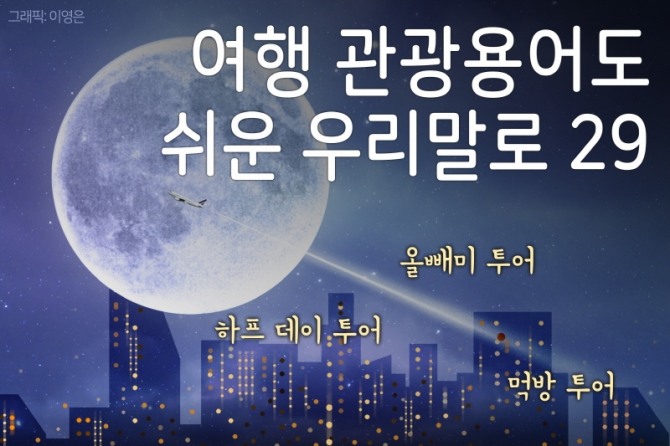 데이 투어(day tour)는 특정한 곳에서 출발해 같은 날 돌아오거나 다른 곳에서 마치는 관광을 말한다. 하프 데이 투어(half-day tour)는 반나절 동안 이뤄지는 관광이다. 영어식 표현은 데이 트립(day trip)을 주로 쓴다. 데이 투어나 데이 트립은 우리말로는 ‘당일 관광’ ‘당일 여행’, 하프 데이 투어는 ‘반나절 관광(여행)’이 되겠다. 하프 데이 트립이라는 말을 쓴다면 이 또한 ‘반나절 관광(여행)’이 좋겠다.