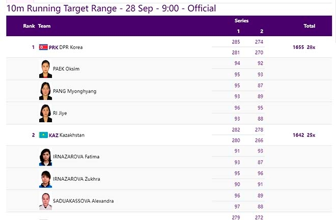 앞서 25일 남자 10m 러닝타깃 정상 종목 단체전에서 한국과 1668점으로 총점이 같았으나 이너텐(Inner Ten·10점 정중앙) 횟수에서 희비가 엇갈려 은메달을 따냈던 북한은 여자부에서는 우승을 차지했다. 사격 러닝타깃은 사냥감처럼 옆으로 움직이는 표적을 맞히는 종목이다.