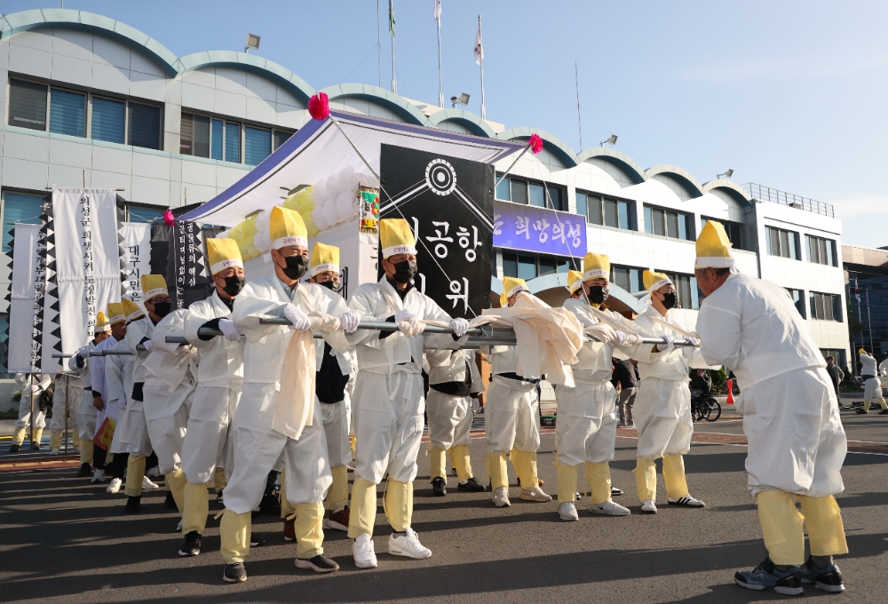 의성군의 반발이 계속되고 있는 가운데 의성군 전체 400개 리 이장으로 구성된 이장연합회가 6일 대구경북 신공항 화물터미널 배치에 반발해 ‘신공항반대’ 군민결의를 다지는 상여 집회를 열었다.