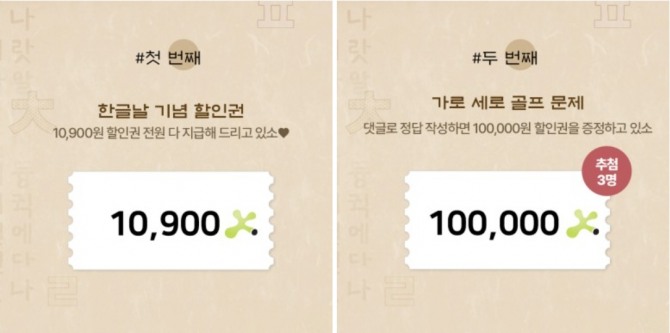 가로세로문제는 이벤트 페이지 내 제시된 문제를 댓글로 작성하면 추첨을 통해 정답자 3명에게 10만원 할인쿠폰을 제공한다. 가로세로문제는 주로 골프를 주제로 한 필수용어 등이 출제됐다. 당첨자는 오는 11월 15일 발표한다.