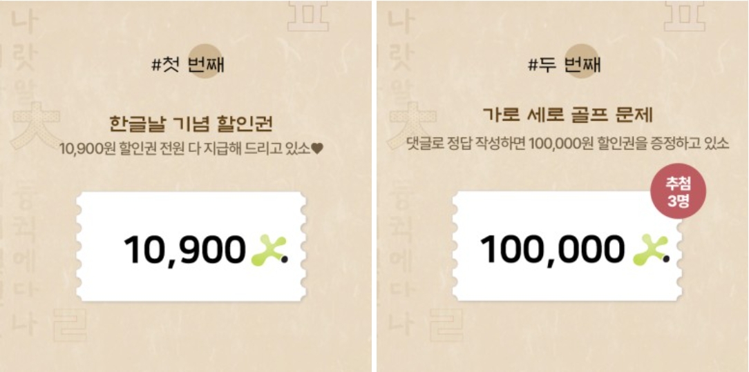 이번 행사는 XGOLF 전회원 대상으로 진행되며 ‘한글날 기념 할인권 증정’과 ‘가로세로문제’로 구성됐다.