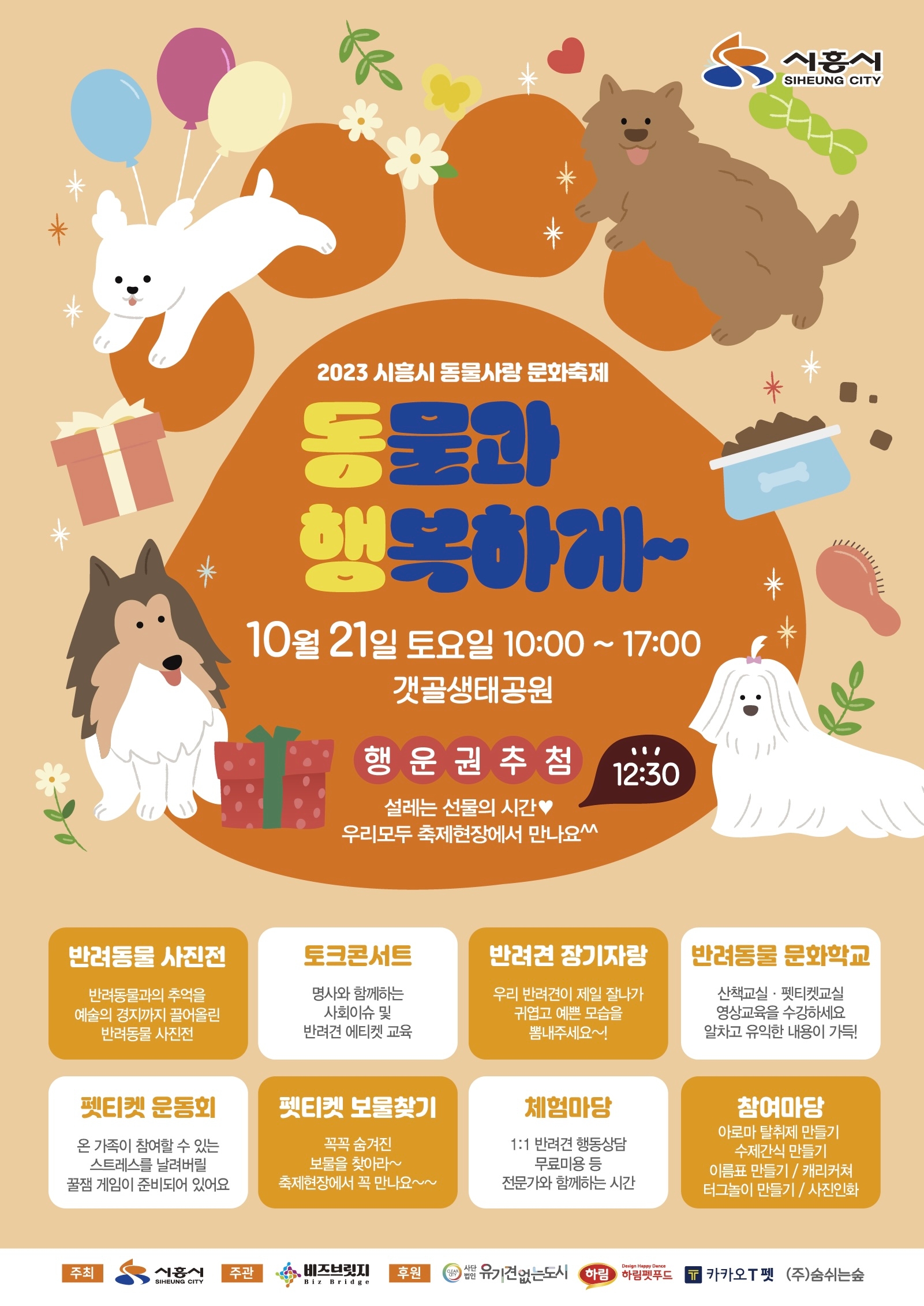 주요 프로그램에는 ▲반려견의 훈련과 행동에 관한 소중한 정보를 얻을 수 있는 영화 스타견의 대부 강성호 교수의 ‘행동교정 토크콘서트’ ▲반려견 산책 교실 및 펫티켓 영상 교실로 구성된 ‘반려동물 문화교실’ ▲시흥시 K-골든코스트 탐방을 주제로 펫티켓 지식을 습득하며 반려동물과 함께 선물을 찾는 ‘펫티켓 보물찾기’ ▲온 가족이 참여하고 즐길 수 있는 ‘반려동물 운동회’, ‘반려동물 장기자랑 대회’ 등이 있다.