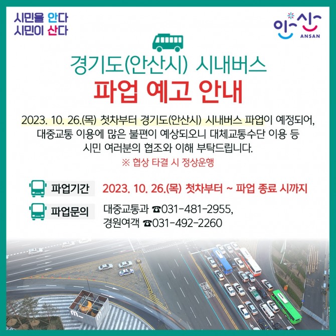 이민근 시장은 “이번 파업 과정에 원만한 노사 합의가 이루어질 수 있도록 노력해 나가는 것은 물론, 시민들의 불편을 최소화하기 위해 안산시청 홈페이지, 안산시 SNS 등을 통해 관련 내용을 상세히 알리고 비상 수송 대책 추진에 온 힘을 다해 나갈 것”이라고 말했다.
