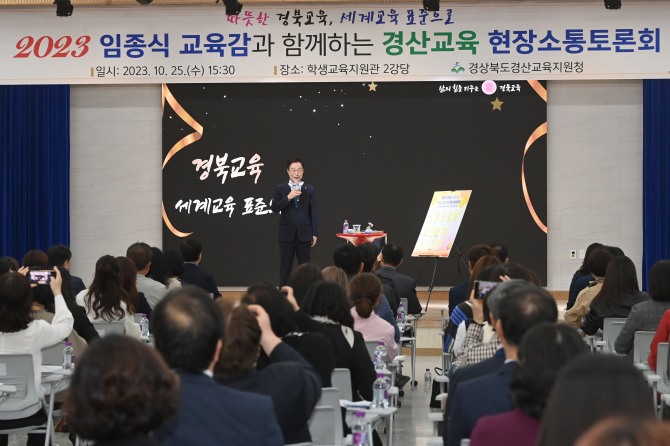 이미지 확대보기27일 도교육청에 따르면 이날 경산교육지원청에서 가진 ‘2023 교육감과 함께하는 경산교육 현장소통토론회’에는 시장, 도의원, 시의원, 관내 유·초·중·고등학교 교(원)장, 학교운영위원장과 학부모회장, 녹색어머니회, 학생상담자원봉사자회, 본청 주민참여예산위원, 공약이행평가단, 주민감사관, 교육계 원로 등 관계자 200여 명이 참석해 경북교육에 대한 뜨거운 관심을 나타냈다.