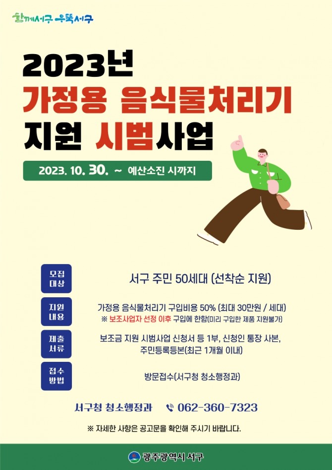 지난 30일부터 서구민 대상 선착순으로 진행되고 있으며, 서구청 홈페이지에 게시된 보조금 지원신청서와 구비서류를 지참해 청소행정과로 방문 접수하면 된다. 이후 보조금 대상자를 선정해 개별 통보할 예정이며, 신청서류 등 자세한 사항은 구 홈페이지 공지사항에서 확인할 수 있다.