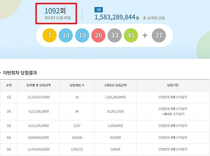 이날 진행된 1092회 로또복권당첨번호(1092회 로또당첨번호) 추첨에서 1등 당첨번호는 7, 18, 19, 26, 33, 45로, 2등 보너스 번호는 37로 나왔다.