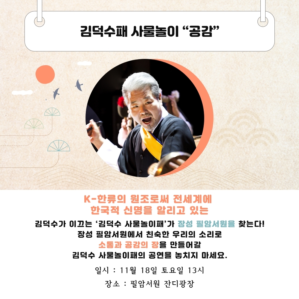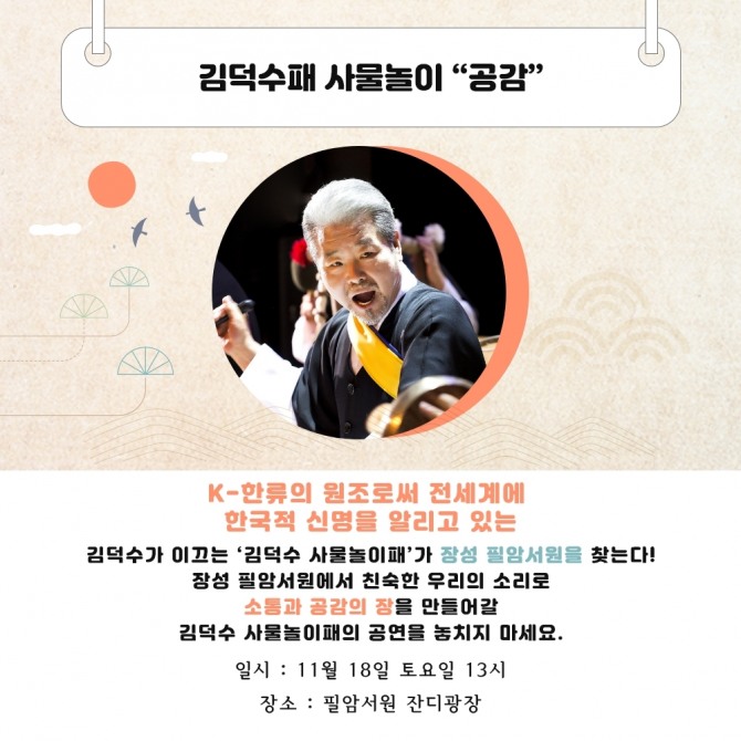 이미지 확대보기전남 장성군이 주말인 18일 오후 1시 유네스코 세계유산 필암서원 잔디밭에서 김덕수패 사물놀이 공연을 연다.