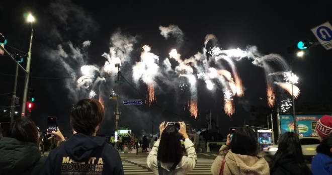 이날 불꽃 드론 800대가 30분간 늦가을 부산 해운대의 밤하늘을 화려하게 수놓자, 해운대를 찾은 관광객과 시민들이 환호하며 아름다운 불꽃 광경을 자신의 핸드폰에 담고 있다.