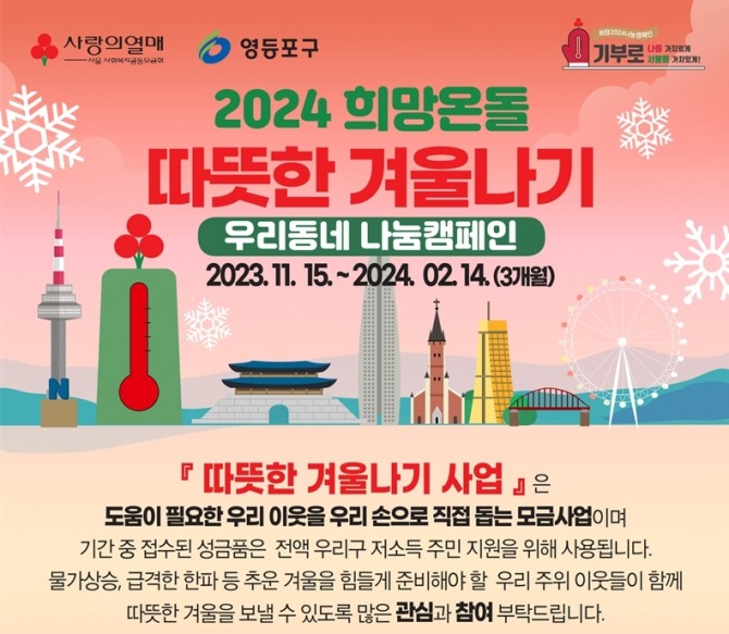올해도 영등포구는 주민, 지역 사회와 함께 기부문화 확산을 위해 15일부터 내년 2월 14일까지 ‘희망온돌 따뜻한 겨울나기’ 모금 캠페인을 연다.