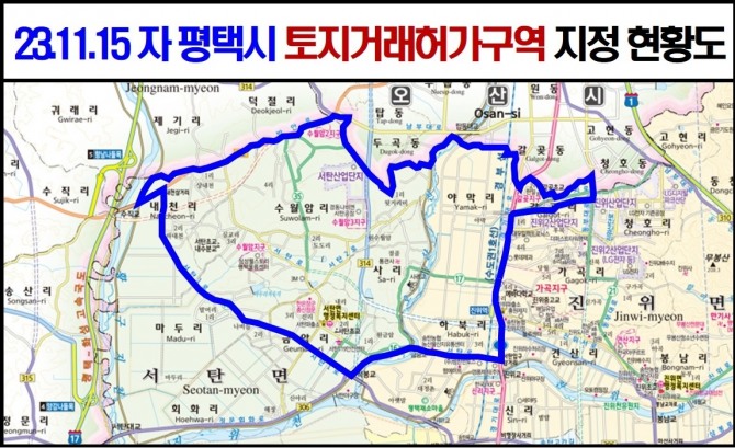 이미지 확대보기이는 국토부가 오산세교3지구에 3만 1000호 공공주택지구를 신규 지정함에 따라 사업지구 주변이 투기가 우려되어, 평택시에는 서탄면 금암리, 내천리, 마두리, 사리, 수월암리 일대 10.13㎢와 진위면 가곡리, 갈곶리, 견산리, 야막리, 청호리, 하북리 일대 4.11㎢로 총 14.24㎢를 허가구역으로 지정됐다.