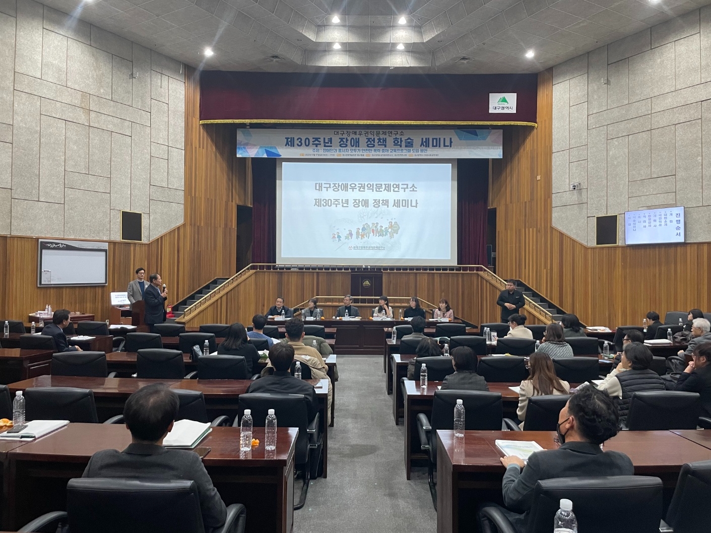 이미지 확대보기이날 대구문화예술회관 달구벌 홀에서 가진 정책 세미나에는 100여 명의 장애인 관련 기관 대표 및 종사자 등이 참석해 뜨거운 관심과 응원을 보냈고, 대구정책연구원 박양호 원장의 축하 메시지와 대구광역시 장애인복지과 정선홍 과장의 격려사 등 각계각층의 지지와 성원이 답지하는 등 성황을 이뤘다.