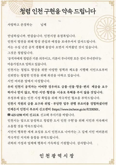 유정복 시장은 서한문에서 “공직자에게 청렴은 기본 의무이고, 기본이 무너지면 모든 것이 무너진다”라며 “공정하고 청렴한 인천을 만들기 위해 시민과 지속해서 소통하겠다”라고 전했다.