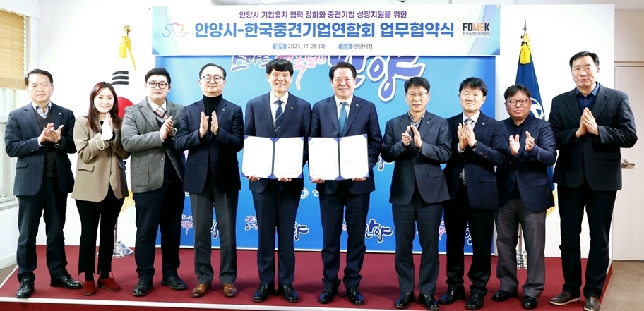 이미지 확대보기이날 협약식은 최대호 안양시장, 최희문 중견련 전무 등 관계자들이 참석해 시는 중견기업 인센티브 및 각종 인허가 행정 절차를 지원하고, 중견련은 시의 유치기업 발굴·매칭 및 홍보에 협력할 것을 약속했다.