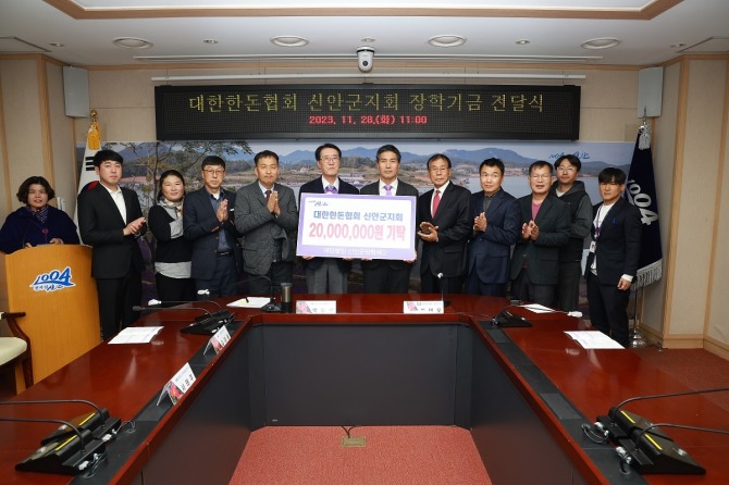 이미지 확대보기대한한돈협회 전남 신안군지회(지회장 박태오) 회원들은 지난 28일 신안군청을 방문하여 인재 육성을 위해 써 달라며 신안군장학재단(이사장 박우량)에 2000만 원을 기탁했다고 29일 밝혔다.