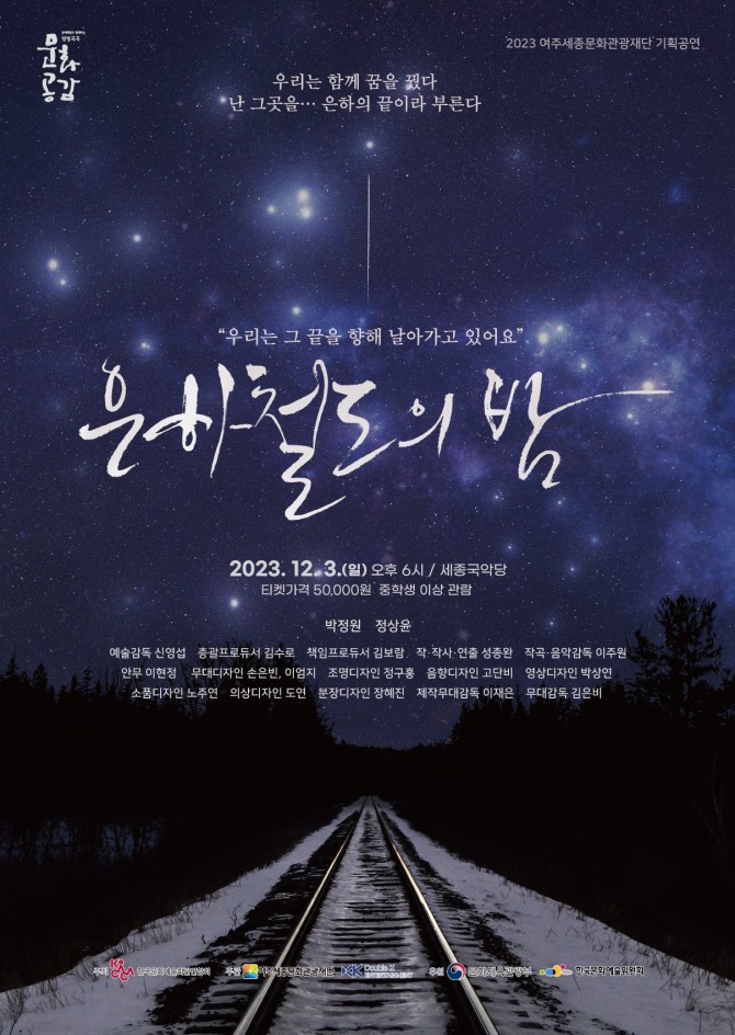 여주세종문화관광재단이 오는 12월 3일 한국문화예술회관연합회 지원사업인 '2023 문예회관과 함께하는 방방곡곡 문화공감 사업'의 일환으로 뮤지컬 '은하철도의 밤'을 세종국악당에서 개최한다고 30일 밝혔다.뮤지컬 ‘은하철도의 밤’은 일본의 대표적인 시인이자 동화 작가 ‘미야자와 겐지’의 소설이자 애니메이션 '은하철도 999'의 원작소설인 '은하철도의 밤'을 각색한 창작 뮤지컬이다. 시력을 잃은 소년 ‘조반니’와 친구 ‘캄파넬라’가 사라져버린 ‘조반니’의 아버지를 찾아 함께 은하수로 떠나는 여정 속에서 빛나는 둘의 우정과 교감의 순간들을 아름답게 표현한 작품이다.