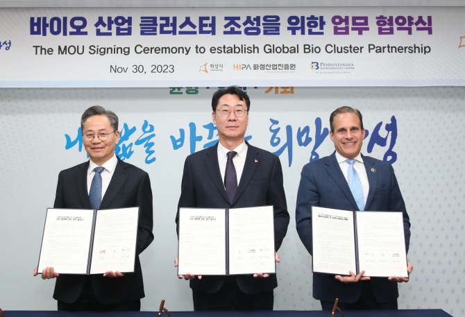 이미지 확대보기이날 협약식은 정명근 시장을 비롯해 Robert J. Christmas 펜실베니아 바이오기술센터 최고운영책임자, 김광재 화성산업진흥원장이 참석했다.