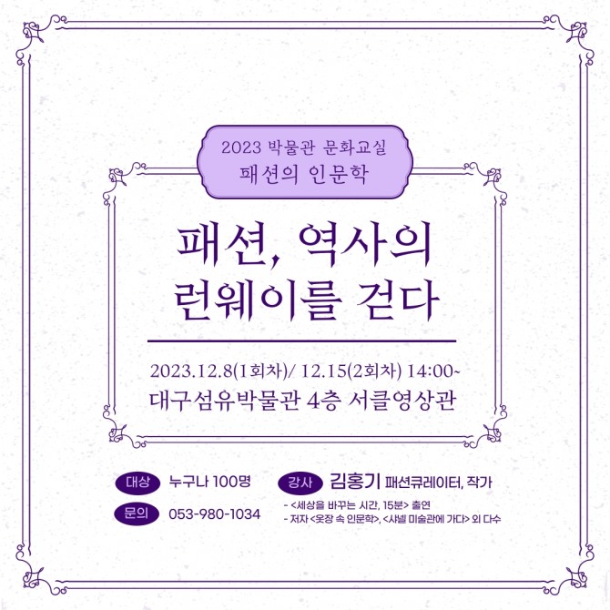 이번 박물관 문화교실 패션 인문학 강의는 다양한 영역에서 패션이 만들어 낸 변화를 전문가와 함께 쉽고 재미있게 풀어내어 지식과 재미를 동시에 전달하고자 마련됐다. 패션 인문학에 관심 있는 시민이라면 누구든 무료로 참여할 수 있으며 자세한 사항은 대구섬유박물관 홈페이지를 통해 확인할 수 있다.