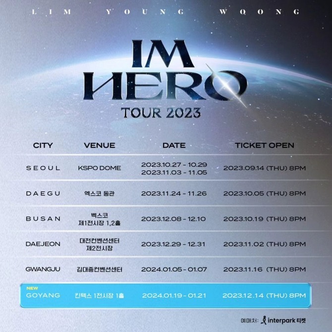 7일 소속사 물고기뮤직은 임영웅의 공식 SNS에는 '아티스트 임영웅 2023 전국투어 콘서트 <IM HERO> 스케줄 고양 추가 안내!'라는 공지를 게재했다.