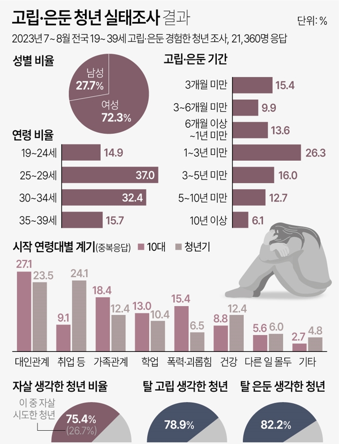 고위험군 8436명을 조사한 결과 고립·은둔 청년 75.4%(6360명)가 자살을 생각했다고 응답했다. 이 중 26.7%(1698명)는 실제 자살시도를 한 경험이 있다고 했다.