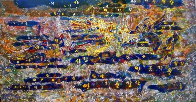 이미지 확대보기역동적인 윤두식 화백의 작품에는 철학과 인생, 삼라만상에 대한 고민과 통찰이 살아 움직인다. 윤 화백은 한국의 전통색인 오방색(청·적·황·백·흑)과 순백의 평면 위에 동박, 려박, 금박의 새로운 요소를 더해 빛에 따라 변주되는 양감의 변화, 그 미묘한 아름다움을 추구한다. 윤두식 작가의 작품세계에서 꾸준히 등장하는 모티브 중 하나는 의인화되어 표현된 학(鶴)들이다. 작가는 다양한 학의 모습과 몸짓, 관계와 풍경들을 통해 음양오행의 원리와 인간사의 희로애락, 인간적 가치와 기원, 소망을 다채롭게 보여주고 있다.