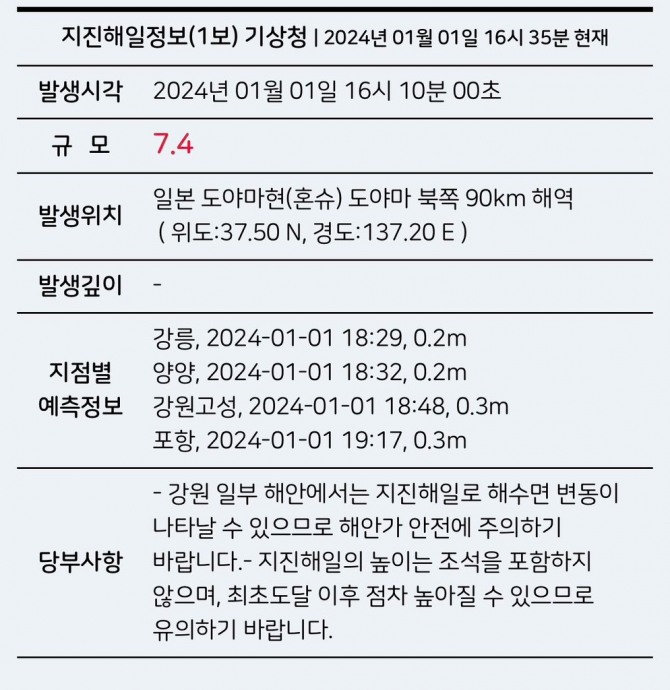 기상청은 "강원해안 일부는 지진해일로 해수면 높이가 높아질 수 있으니 안전에 주의해달라"면서 "지진해일 높이는 조석을 포함하지 않아, 해안에 도달 후 점차 높아질 수 있다"고 설명했다.