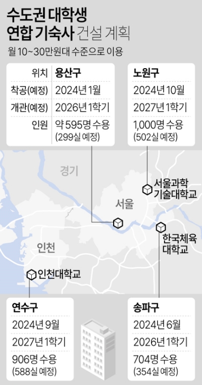 서울 용산과 한국체대 기숙사는 각각 2026년 1학기, 인천대와 서울과기대 기숙사는 각각 2027년 1학기 개관을 목표로 한다.