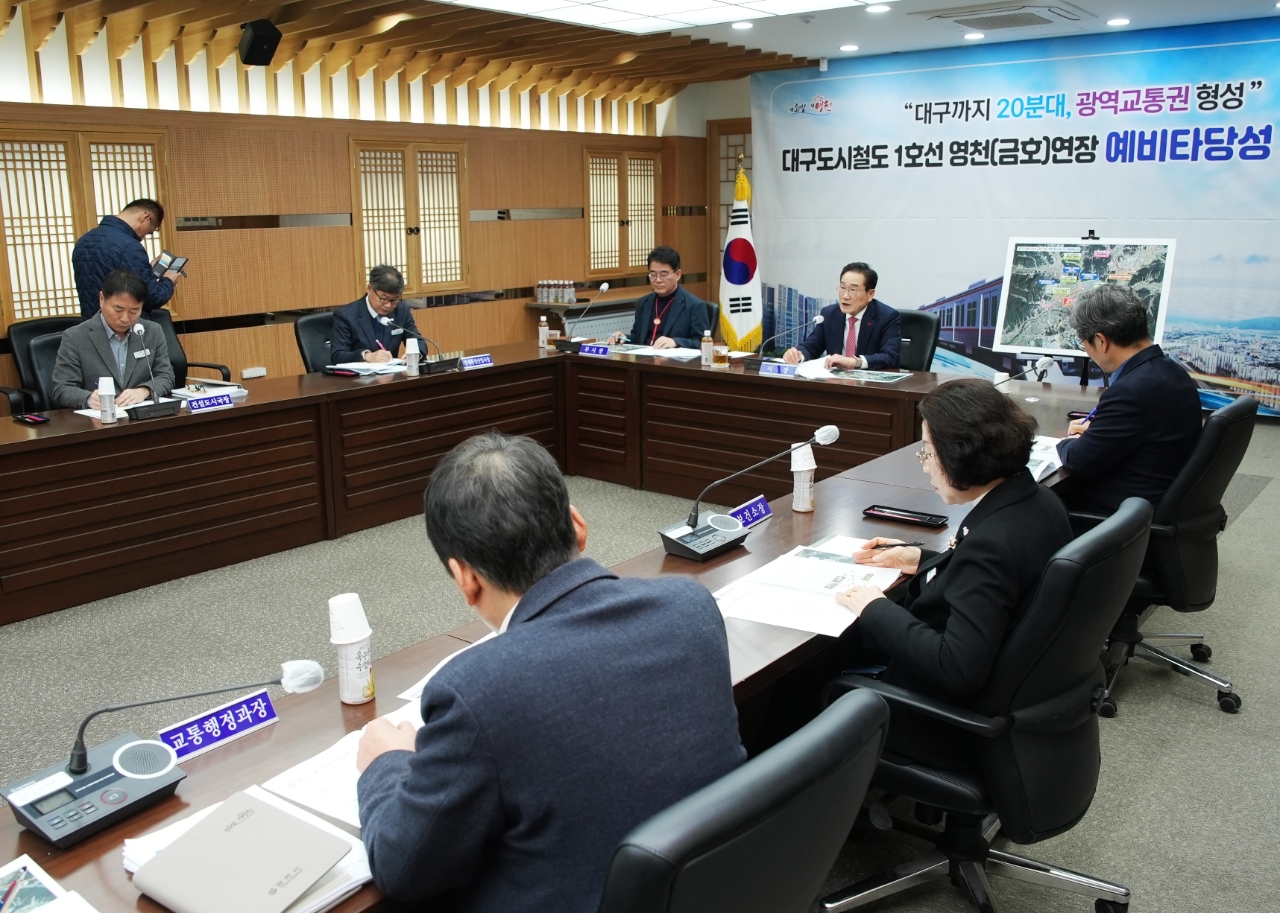 이미지 확대보기영천시는 이날 최기문 시장을 비롯해 간부 공직자, 관련 부서장 등 약 30여 명이 참석한 가운데 ‘예타 통과에 따른 시정 전략점검 회의’를 개최하고, 도시철도 예타통과 경과보고와 함께 주변 SOC사업, 연계대응사업에 대해 심도 있게 점검하는 등 전략 수립에 머리를 맞댔다.