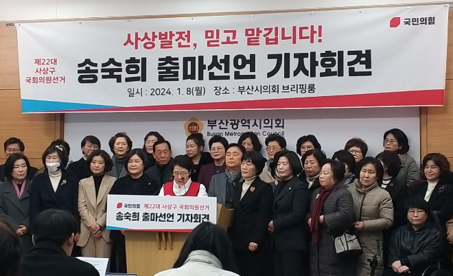 한편, 이날 '뚝심구청장, 부산아지매'를 자처한 송 전 여성특보의 출마선언 기자회견에는 국민의힘 김효정, 배영숙, 임말숙, 정태숙 등 시의원 4명과 여성단체 관계자 등이 대거 참석해 눈길을 끌었다.