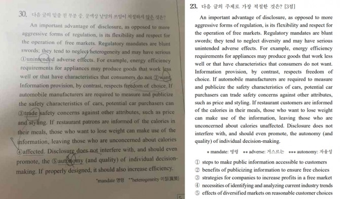 영어 23번은 지문을 읽고 주제를 찾는 3점짜리 문항이었는데, 여기에 출제된 지문은 캐스 선스타인(Cass Sunstein) 하버드대 로스쿨 교수가 출간한 ‘투 머치 인포메이션(Too Much Information)’에서 발췌된 것으로 알려졌다. 책은 당시 국내에 출간되지 않았다.