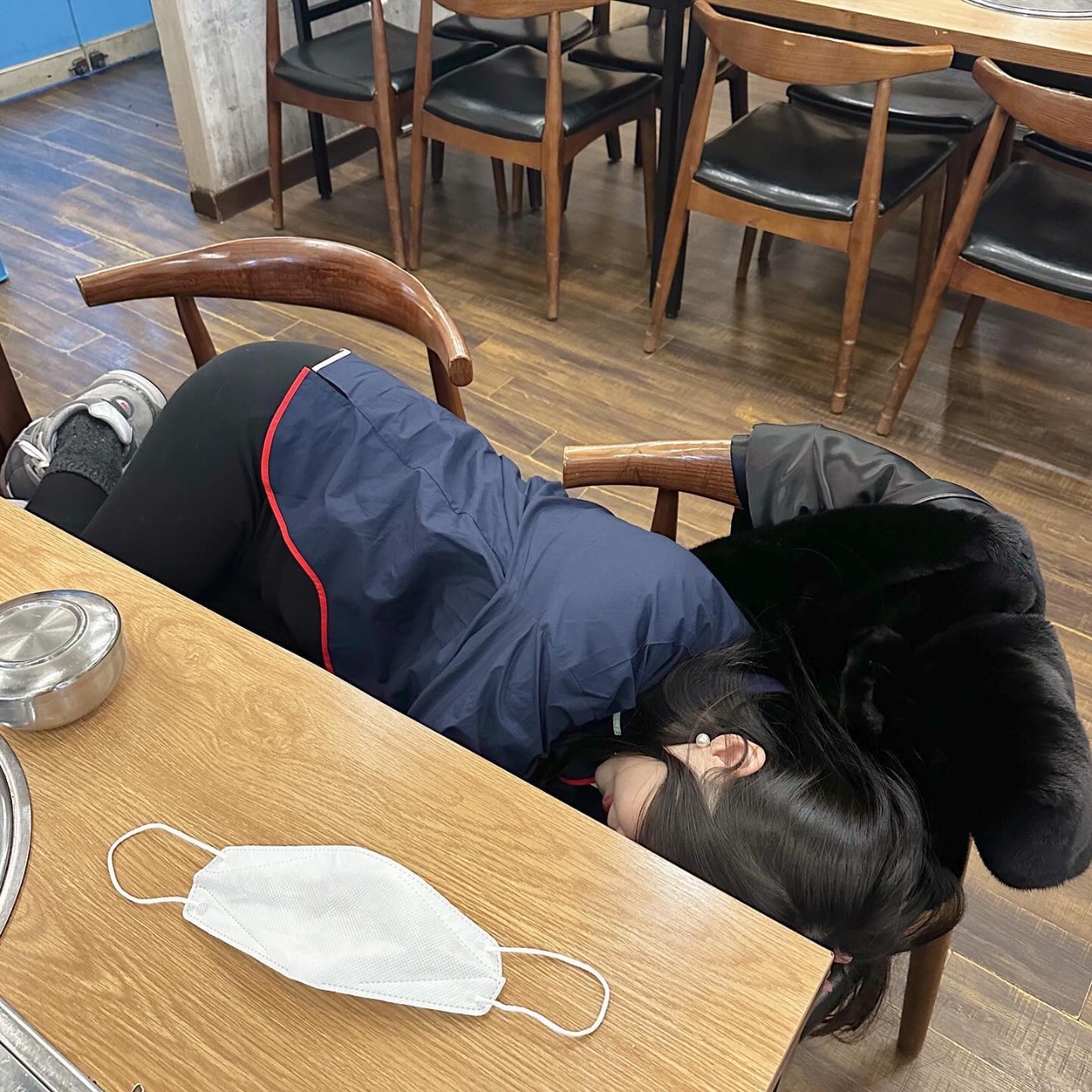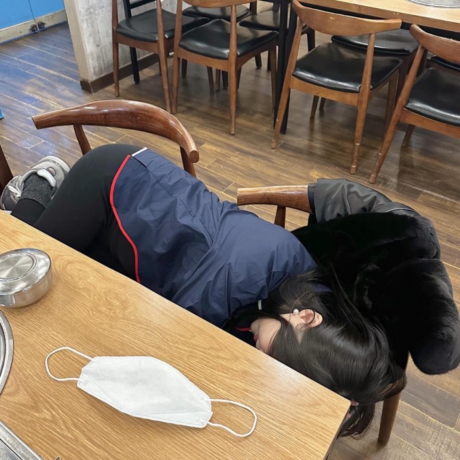 사진에는 식당 의자에 누워 있는 윤지연의 모습이 담겨 안타까움을 자아냈다.
