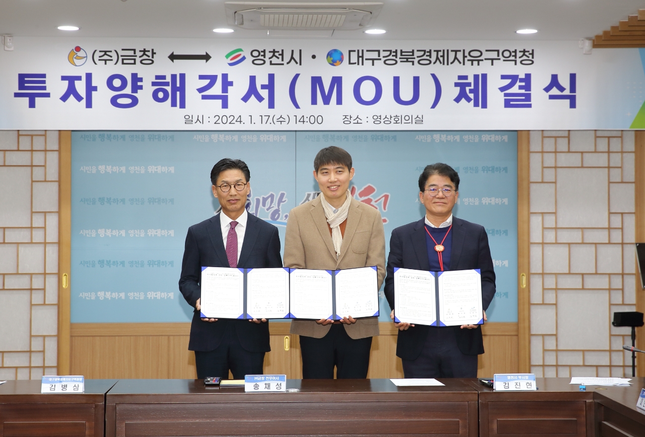 이미지 확대보기㈜금창은 이를 위해 17일 영천시청에서 김병삼 대구경북경제자유구역청(이하 대경경자청), 최기문 영천시장, 송재열 금창 대표이사 등 관계자들이 참석한 가운데 국내복귀투자를 성공적으로 추진하기 위한 투자양해각서(MOU)를 체결했다.