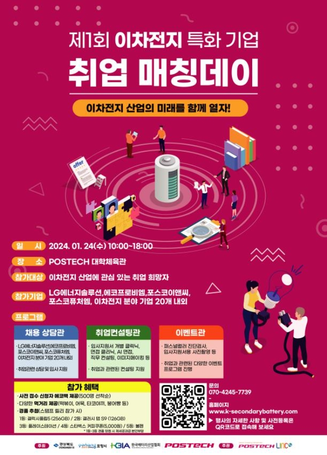 참가자들의 교통편의를 위해 포항역, 포항 시외버스터미널 등에서 셔틀버스도 운영한다. 이날 행사와 관련한 자세한 내용은 제1회 이차전지 특화기업 취업 매칭데이 홈페이지(www.k-secondarybattery.com)에서 확인할 수 있다.