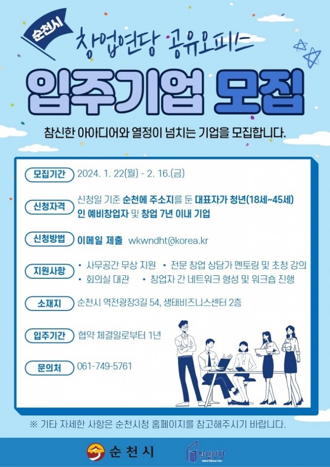 이미지 확대보기전남 순천시는 사무공간이 필요한 창업 7년 이내의 청년 사업가와 예비 청년 창업자를 대상으로 창업연당(순천시 창업지원센터) 내 공유오피스 입주기업을 오는 2월 16일까지 모집한다고 밝혔다.