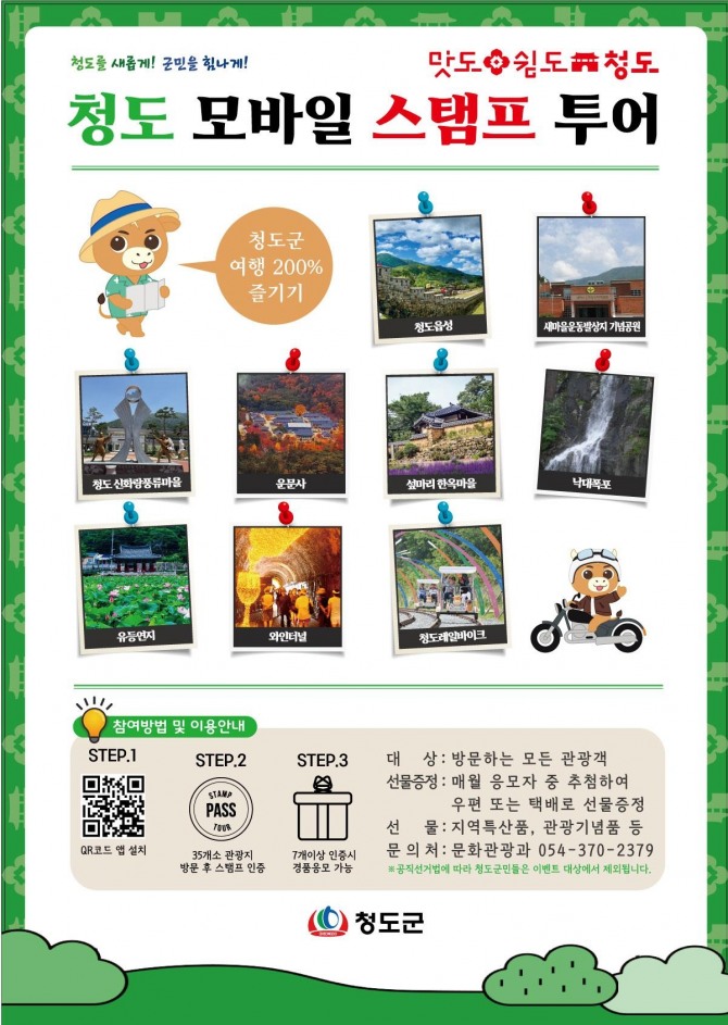 한편, 청도군 스탬프 투어는 스마트폰 플레이스토어나 앱스토어에서 ‘스탬프 투어’ 앱을 설치하면 안내받을 수 있다.