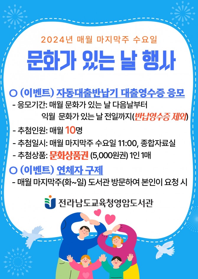 매월 문화가 있는 날 다음 날부터 익월 문화가 있는 날 전일까지 대출영수증을 응모하면 추첨을 통해 도서문화상품권(5000원권)을 1매씩 증정한다.