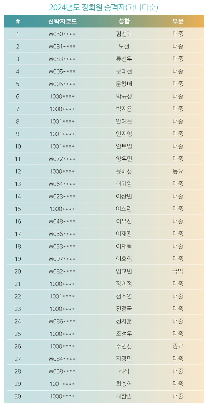 이미지 확대보기1일 한음저협에 따르면 2024년 1월 기준 5만 1천여 명의 작사, 작곡가의 저작 재산권을 신탁 관리하고 있는 한음저협은 매년 협회 규정에 의거 준회원 가운데 가입 기간별 저작권료 상위 기준에 따라 전체 음악 분야에서 27명을, 비대중 음악(순수, 국악, 동요, 종교) 분야에서 3명을 정회원으로 승격시킨다.