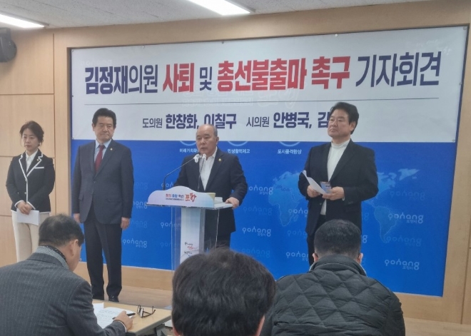 이미지 확대보기7일 한창화·이칠구 경북도의원, 안병국·김민정 포항시의원은 포항시청 브리핑룸에서 기자회견을 열고 ‘온갖 비리 의혹에 싸여 있고 지역 분열, 갈등을 초래한 김정재 의원의 3선 출마 포기’를 촉구했다.