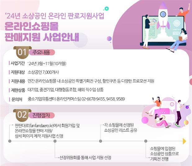 이미지 확대보기이 사업은 소상공인 제품의 온라인 판매 활성화와 시장 경쟁력 강화를 목표로 한다. 국내 종합몰, 오픈마켓, 크라우드펀딩 등을 통해 소상공인만을 위한 다양한 프로모션을 지원하여 온라인 판매 채널 확대를 돕는다.