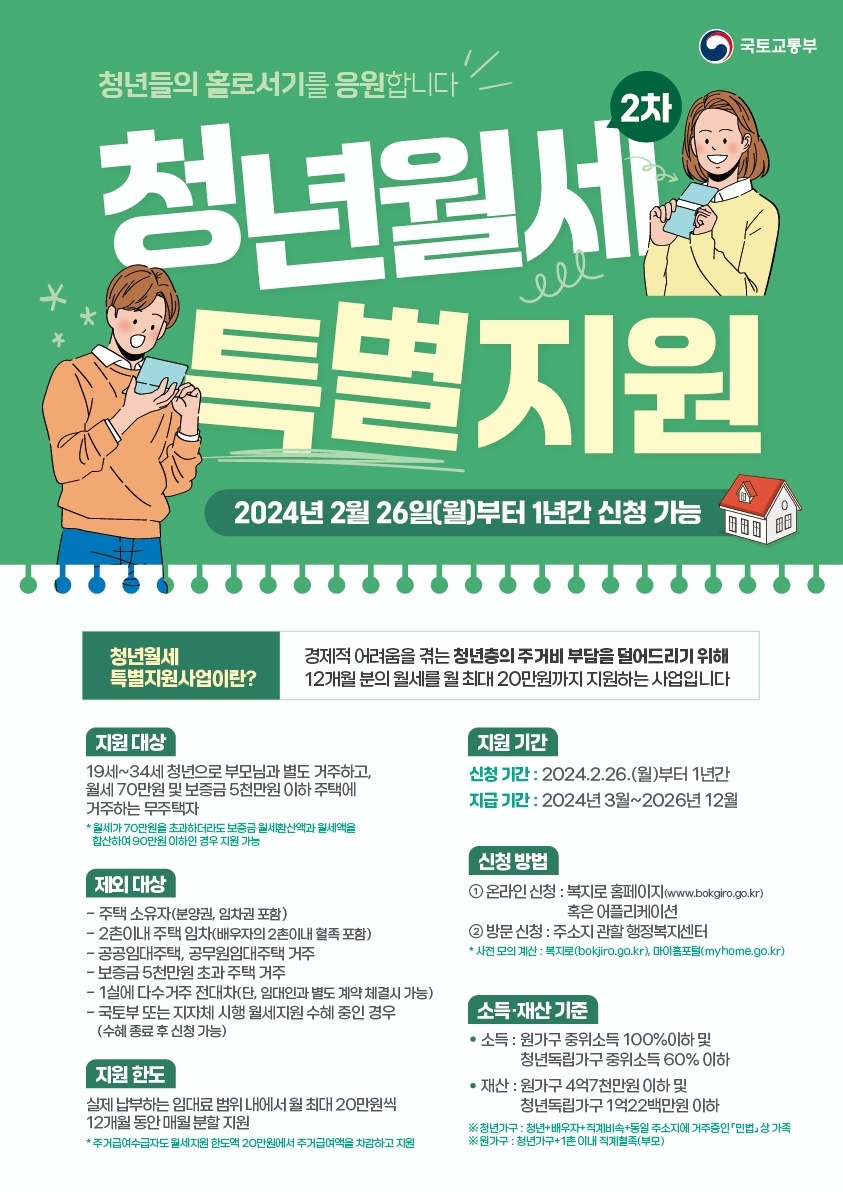 청년월세 한시 특별지원사업 신청은 2024년 2월 26일부터 예산소진 시까지 주소지 읍면 사무소 또는 온라인(복지로)에서 신청하면 된다. 지급 대상자로 선정되면 12개월간 매월 25일에 실제 납부하는 임대료 범위 내에서 최대 20만 원씩 지원된다.