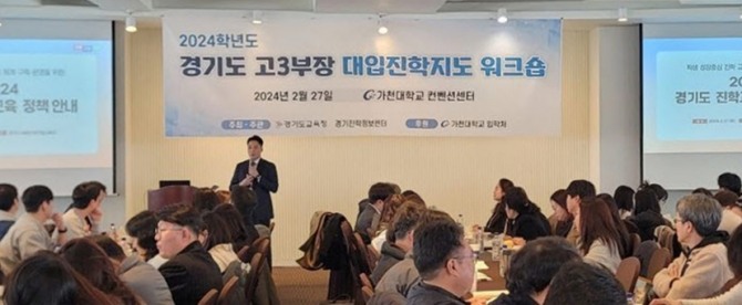주요 내용은 2024 경기도교육청 진학교육 정책, 2025학년도 대입전형 주요 사항, 학생부종합전형 평가와 전망을 도교육청 진학담당 장학사와 경기도 대입진학지도 리더교사, 대학입학사정관이 차례로 나서서 안내했다.