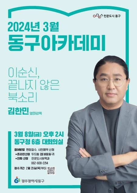 광주 동구는 오는 3월 개강하는 동구 아카데미에 최근 ‘노량:죽음의 바다’를 개봉하고 한국 영화 사상 최다 관객을 동원한 ‘명량’을 연출한 김한민 감독을 초청한다고 밝혔다. 제269회 동구 아카데미는 3월 8일 오후 2시 구청 6층 대회의실에서 ‘이순신, 끝나지 않은 북소리’를 주제로 하는 김한민 감독의 강연으로 올해 첫 아카데미의 문을 연다.