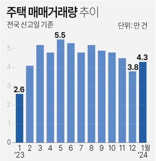 이미지 확대보기29일 업계에 따르면 국토교통부가 발표한 '2024년 1월 주택통계'를 살펴본 결과 지난 1월 주택 매매거래량(신고일 기준)이 4만3033건으로 한달 전인 지난해 12월 3만8036건보다 13.1% 증가했다.