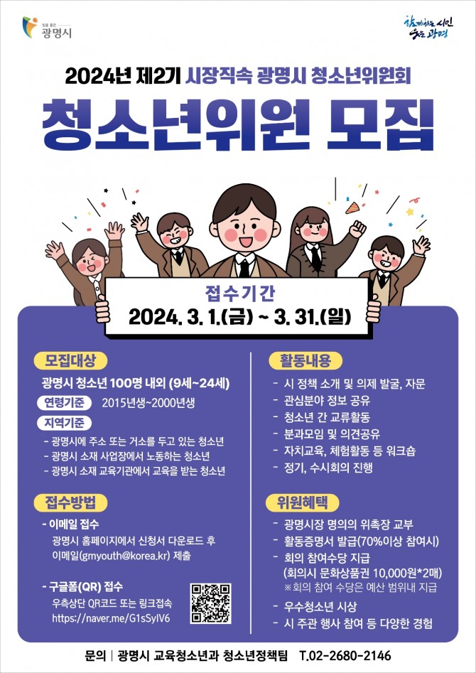 참여를 원하는 청소년은 광명시 누리집에서 지원서 양식을 내려받아 작성한 후 이메일로 제출하거나 포스터 하단 QR을 통해 구글폼으로 접수하면 된다.
