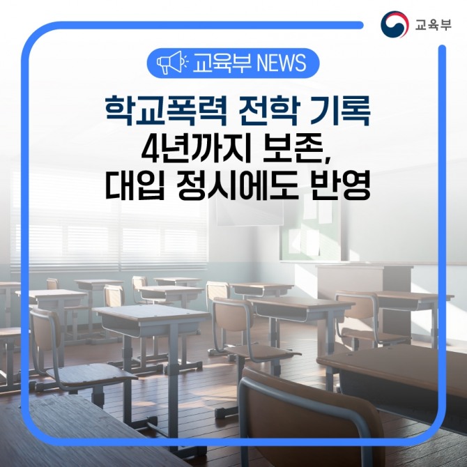 김연석 교육부 책임교육정책실장은 “이번 시행규칙 개정으로 2024년 3월부터 가해 학생의 학생부 조치 기록을 체계적으로 관리하고 보존기간을 연장함에 따라 학교폭력 가해 시 진학 및 졸업 이후까지도 불이익을 받을 수 있다는 경각심을 높여 학교폭력 예방에 기여할 것으로 기대한다”고 밝혔다.
