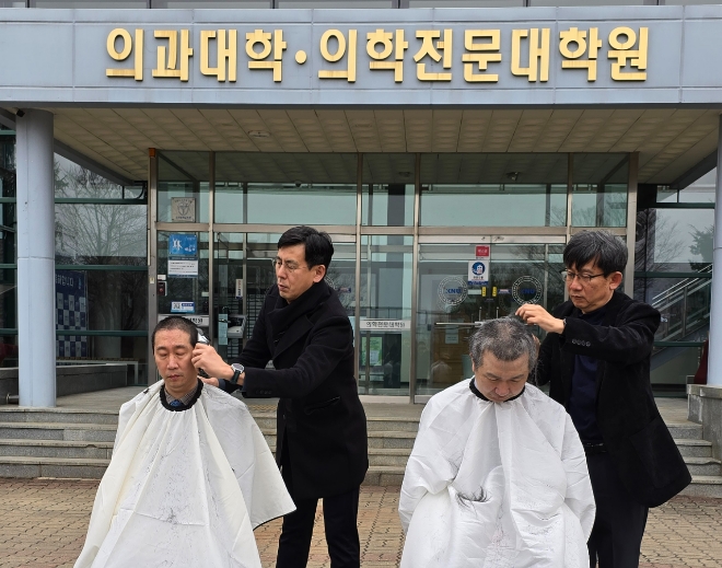 이미지 확대보기5일 강원대에 따르면 해당 대학의 의대 교수 10명은 대학 측의 증원 규모 결정에 반대하며 삭발을 감행했다.